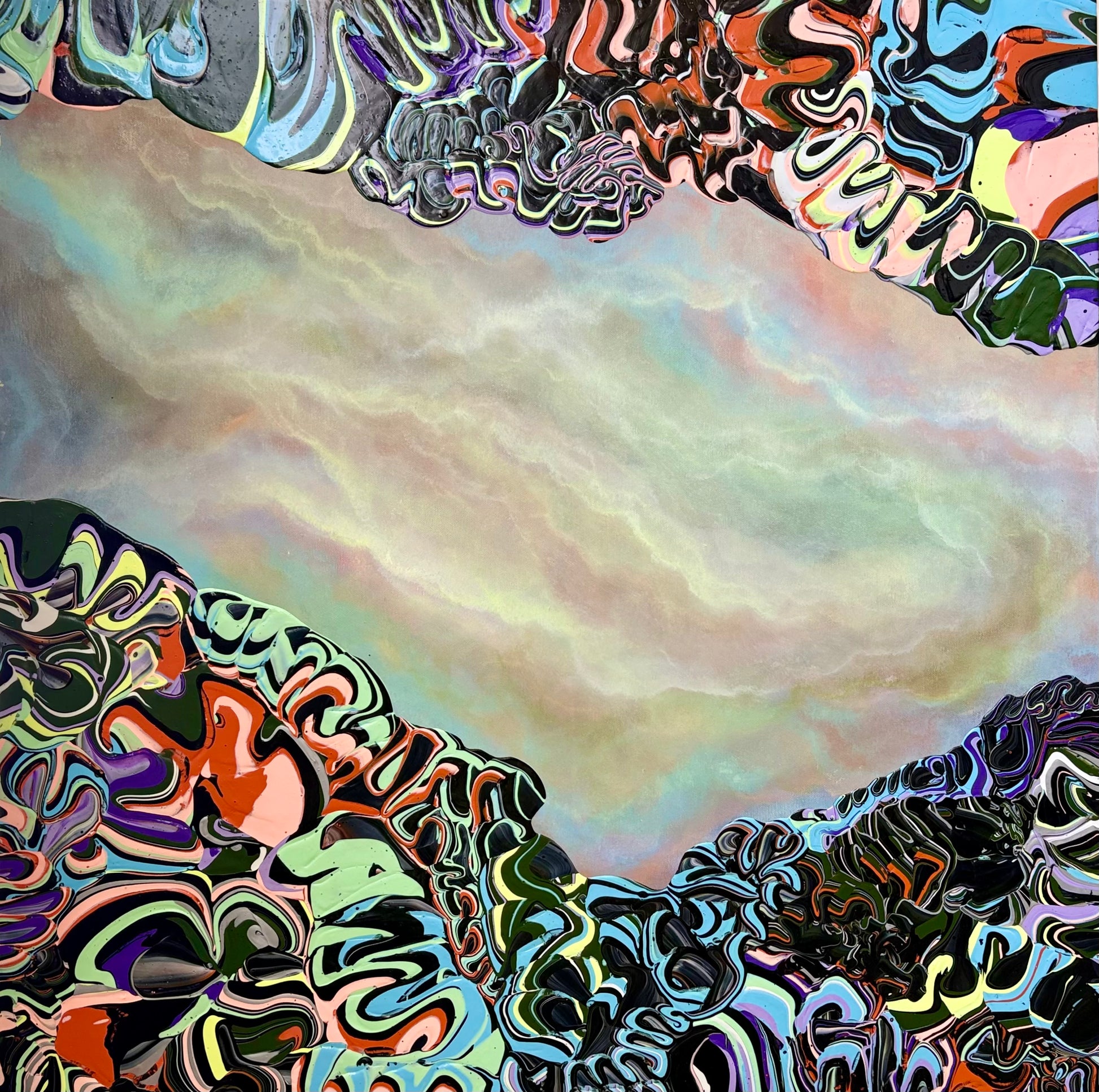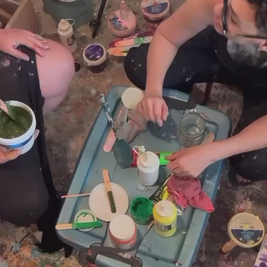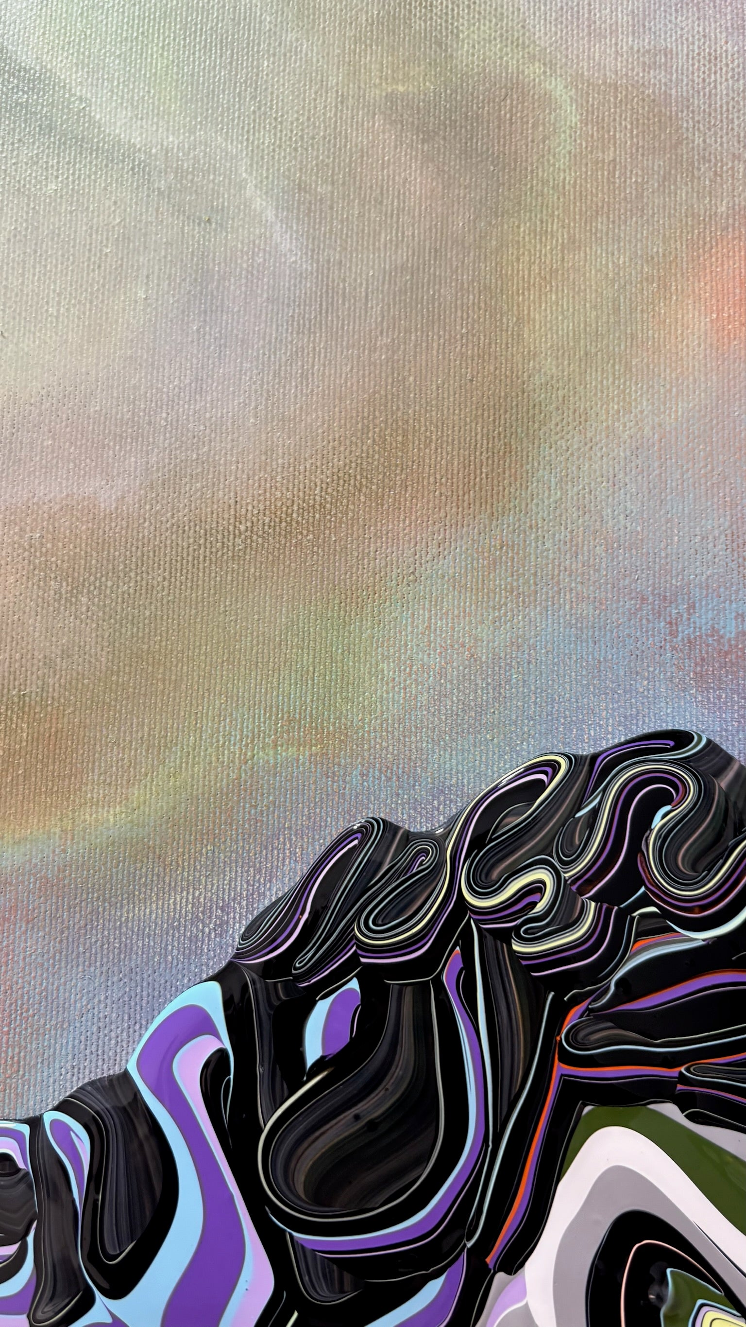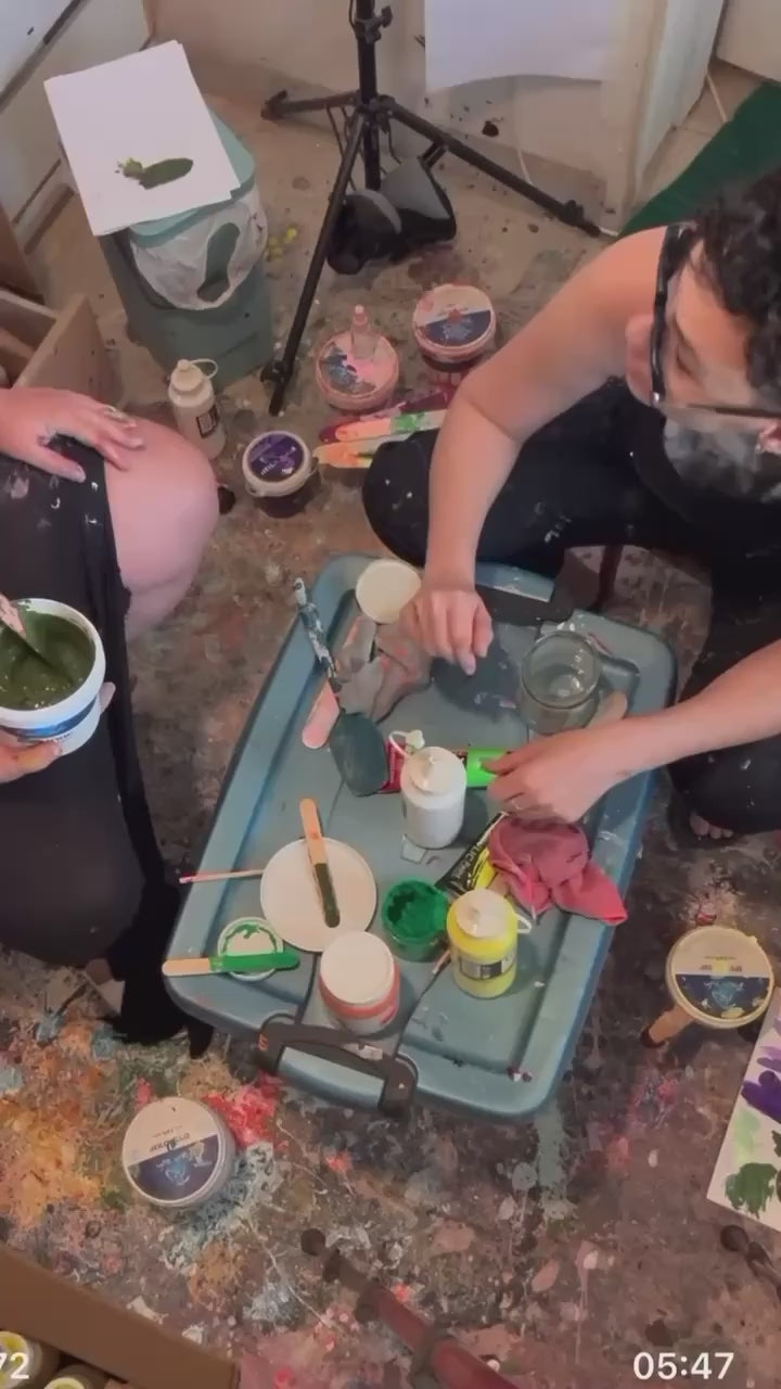 this piece comes from a collaboration with the swedish/israeli artist, alexandra gunnarsson (on instagram @alexochgunnar) and the canadian artist, dermai zan young (on instagram @art_dzy). after a dip at dawn in a local spring, we sat facing each other in silence, eyes closed, taking turns to see what color came to the surface. we committed to being ok with not knowing what would happen on the canvas, and gave ourselves permission to make something terrible. each artist took their turn with no interference from the other. it was a practice of being in the moment, trust, and flowing together.